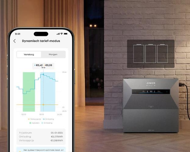 Anker Intelligence™ is het slimme energiemanagementsysteem dat het laden en ontladen van je batterij automatisch aanstuurt. De thuisbatterij wordt geladen wanneer stroom goedkoop is, zelfs bij negatieve tarieven en gebruikt die energie op dure piekmomenten. Zo bespaar je direct op je energiekosten, terwijl het systeem alles voor je regelt.