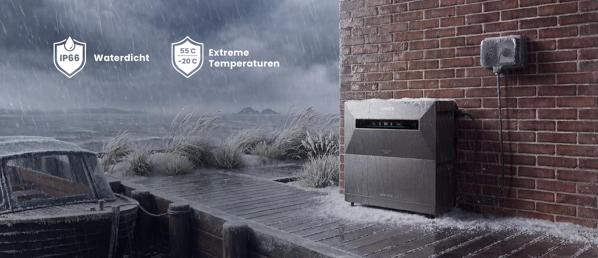 Altijd betrouwbare energie, het hele jaar door. Met IP-66 bescherming En C5-M corrosiebestendigheid is de Anker SOLIX Solarbank Max AC bestand tegen zware omstandigheden. Dankzij actieve verwarming tot -20° blijft je systeem volledig operationeel binnen en buiten.